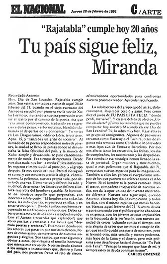 Carlos Giménez: "Tu país sigue feliz, Miranda" / artículo, El Nacional, Caracas 28 de febrero de 1991